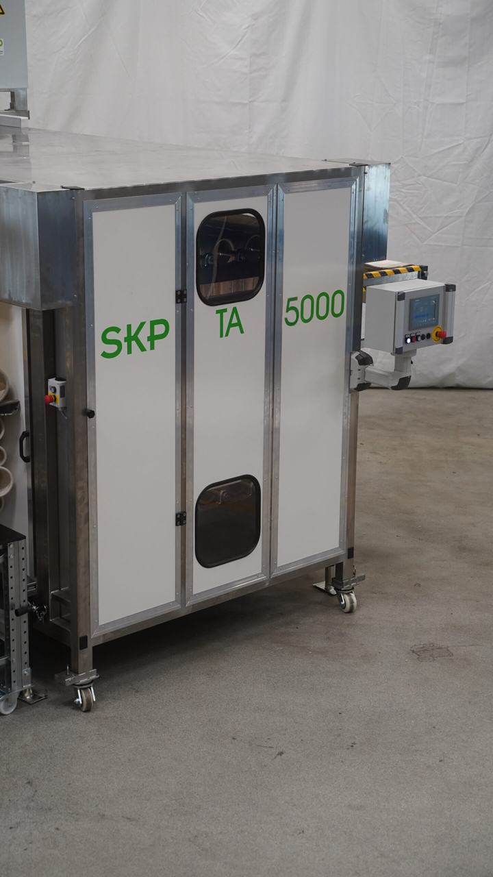 Konventionelle Planenreinigungsanlagen sind effizient in der Reinigung und in der Trocknung der Planenoberfläche. Planenbereiche mit starker Feuchtigkeitsaufnahme stellen auch heutzutage noch eine Herausforderung dar. Hierzu gehören vor allem Keder. Die Trocknung der konventionellen Keder erfordert Zeit, bewegte trockene Luft und Temperatur. Einzigartig auf dem europäischen Markt sind hier die Trocknungsanlagen der SKP. Die TA5000 funktioniert nach einem patentierten Durchlaufprinzip. Die Planen werden über mehrere Umlenkwellen durch die Anlage transportiert.